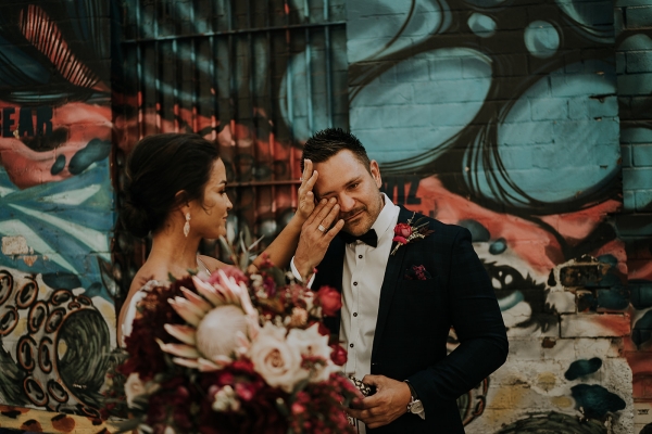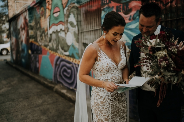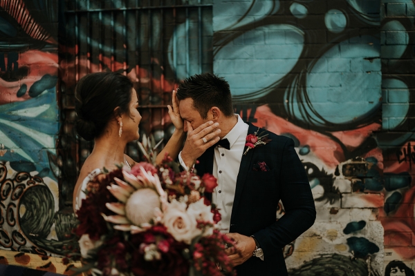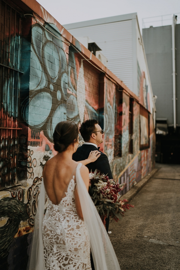 One big thing we both knew we wanted to do was a First Look. We knew that we were both emotional people and needed this time to take a breath together and enjoy ‘our moment’ before we saw one another and our friends at the end of the aisle. So our Photographer and Videographer organised for Travis to wait in an urban spray-painted alleyway in the heart of Brisbane’s Fortitude Valley.