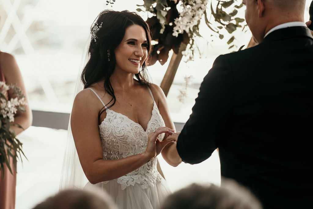 We loved seeing our gold hexagonal wedding ceremony setup on the rooftop terrace with sweeping views of the Brisbane City skyline in the backdrop.
