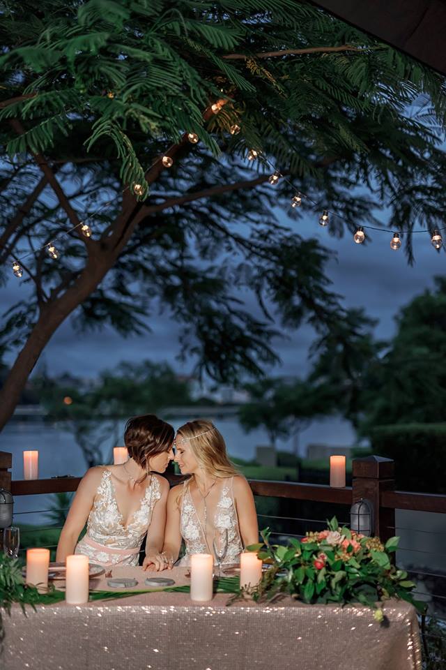 With their Celebrant at the ready, the two brides wore vibrant flower crowns created by Flora Organika as a great alternative to bouquets. These coordinated perfectly with the 2 beautiful fresh floral arrangements, carefully positioned on the wooden circular arbour. The wooden circular arbour was also adorned with softly wrapped blush draping styled by Brisbane Wedding Decorators, framing the brides in this dreamy setting as Brisbane Celebrant Jamie Eastgate guided them through the ceremony.