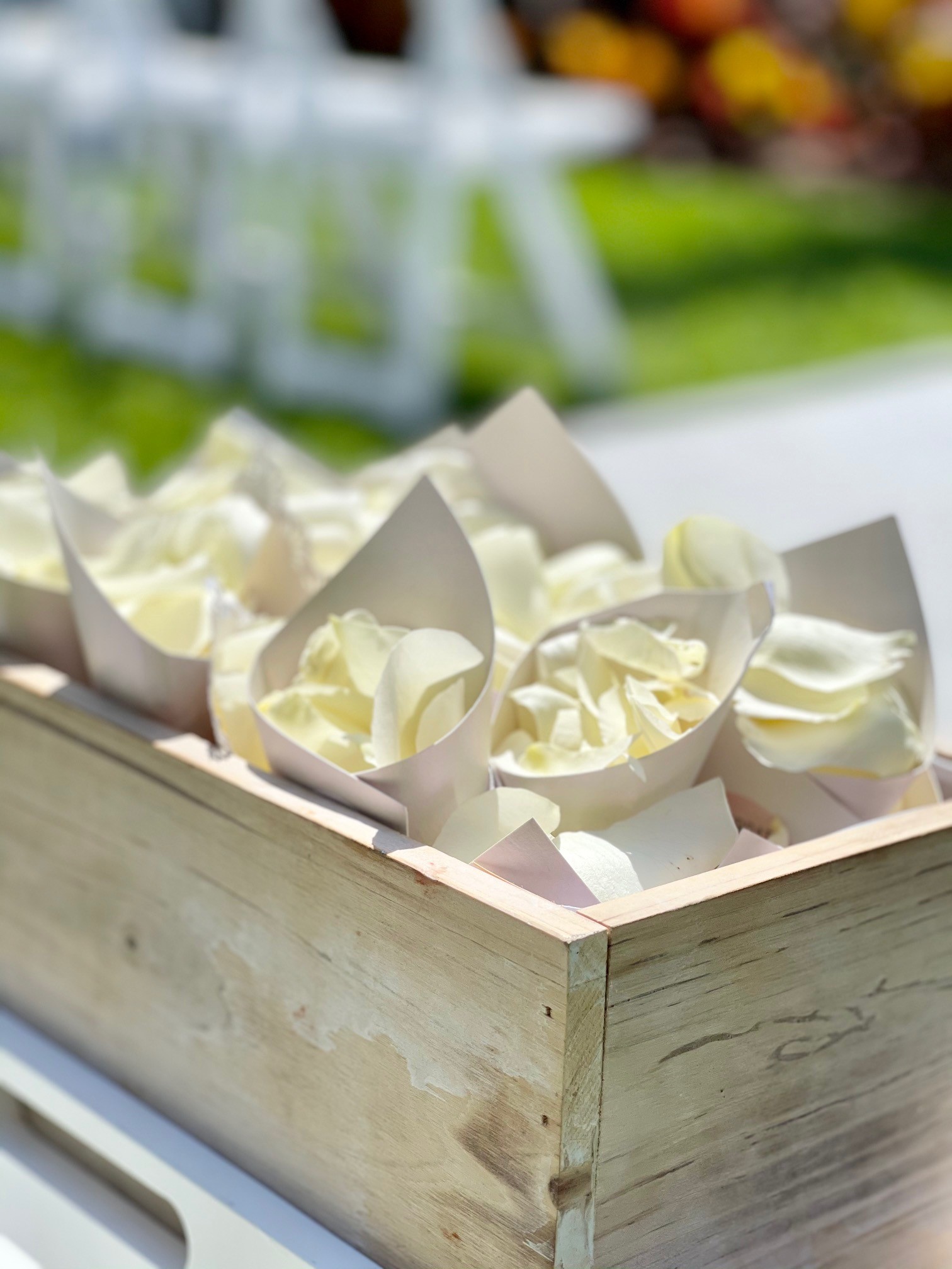 Beautifully presented rose petal cones and our white curved wedding arch.