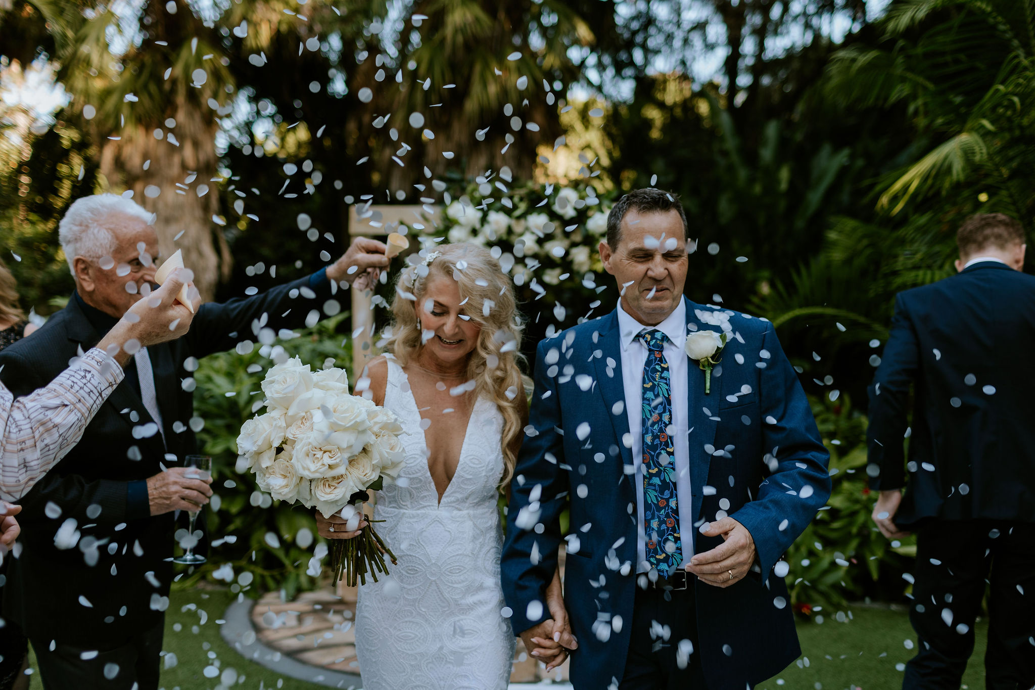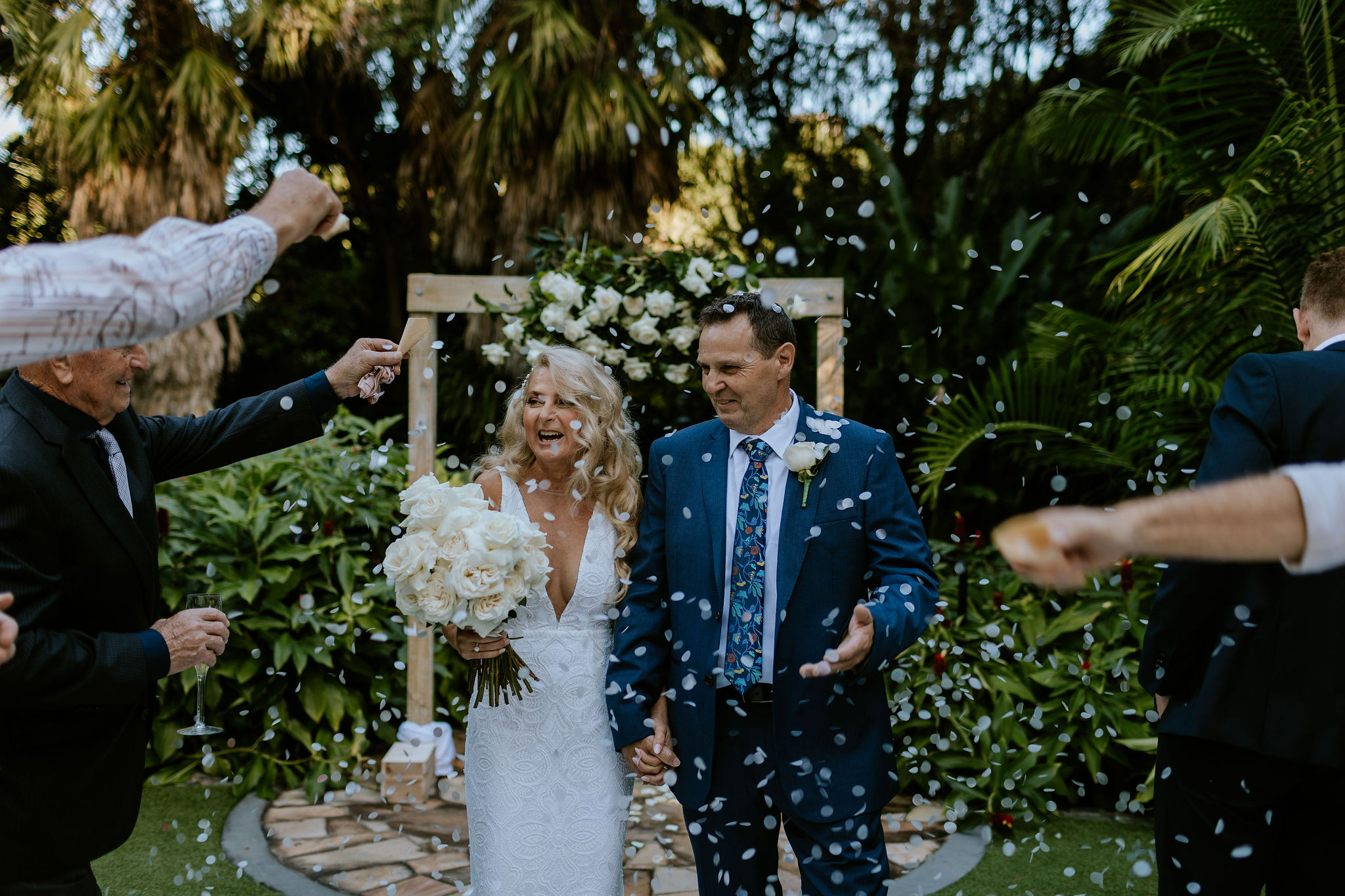 We had so much fun styling this Mt Coot-tha wedding at Palm Tree Lawn. The couple opting for our chic wooden wedding arbour combined with classic white and ivory fresh flowers, concluding the ceremony with an incredible shower of bio confetti.
