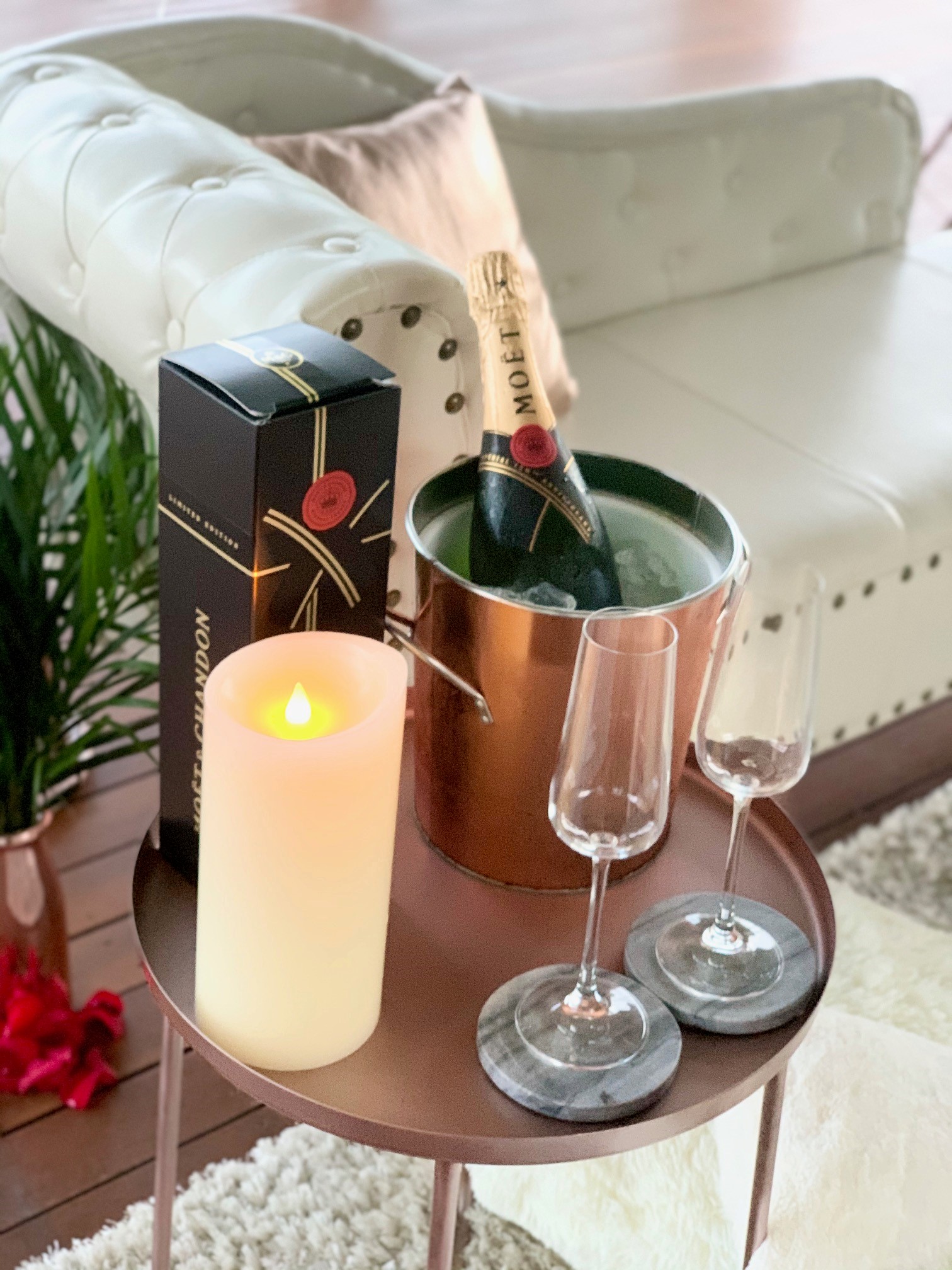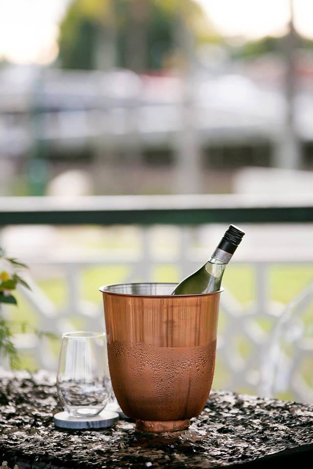 Our client arranged for her favourite white wine to be chilled on ice accompanied by our stemless wine glasses on marble coasters.