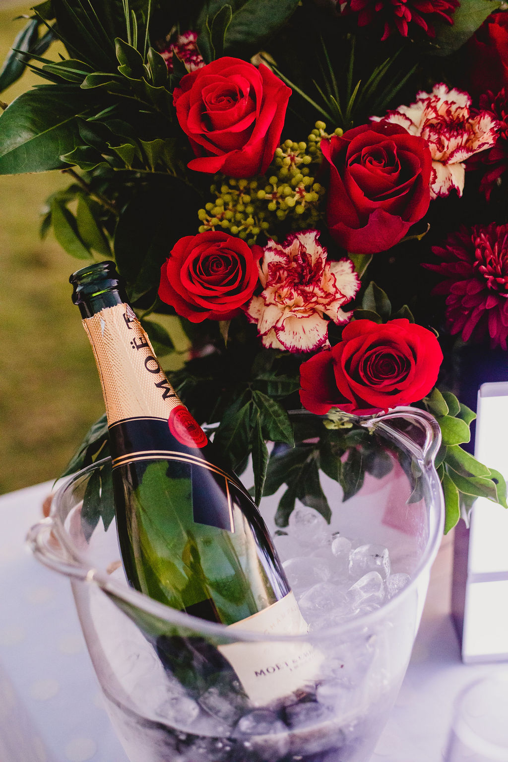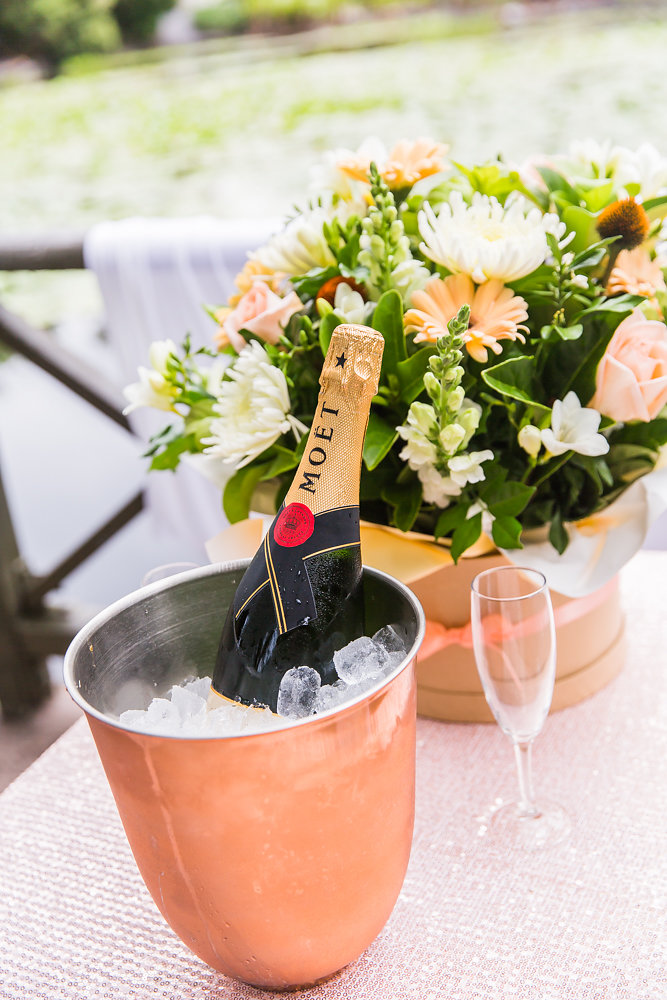 We created a romantic rose petal aisle lined with fresh floral bouquets in sweet shades of peaches and pinks lining the aisle on shepherd hooks, leading to a sweetheart table with a sparkling rose gold tablecloth and ice filled wine cooler with a chilled bottle of MOET ready for the celebrations.
