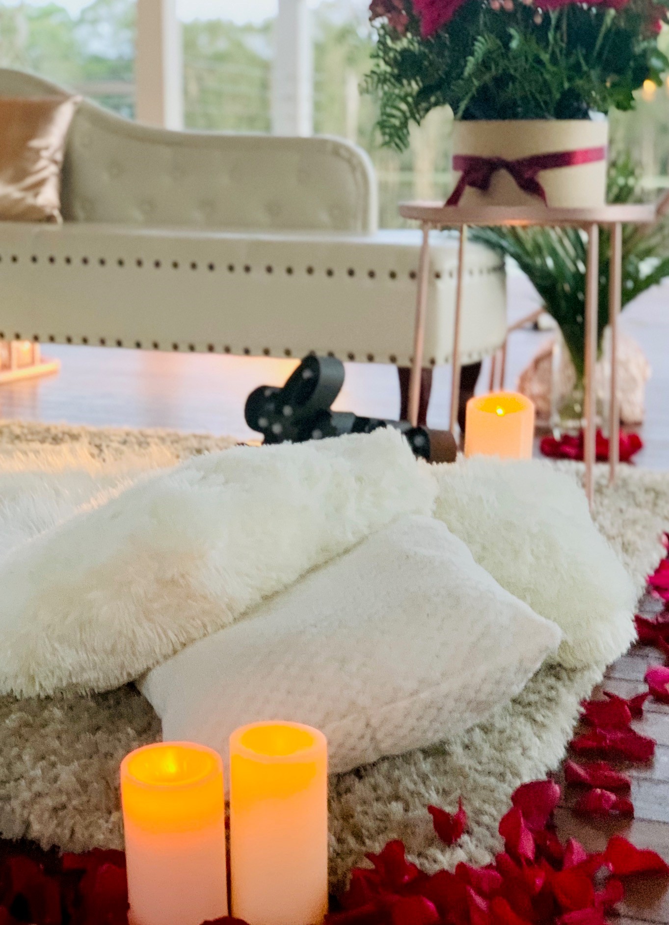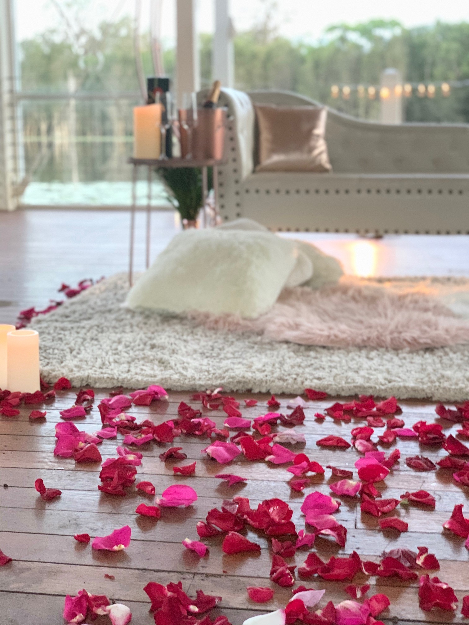 It was the best surprise and he did it so incredibly well! He walked me down an aisle of fresh rose petals lined with flickering candles and pink roses, then he dropped to one knee and popped the question!